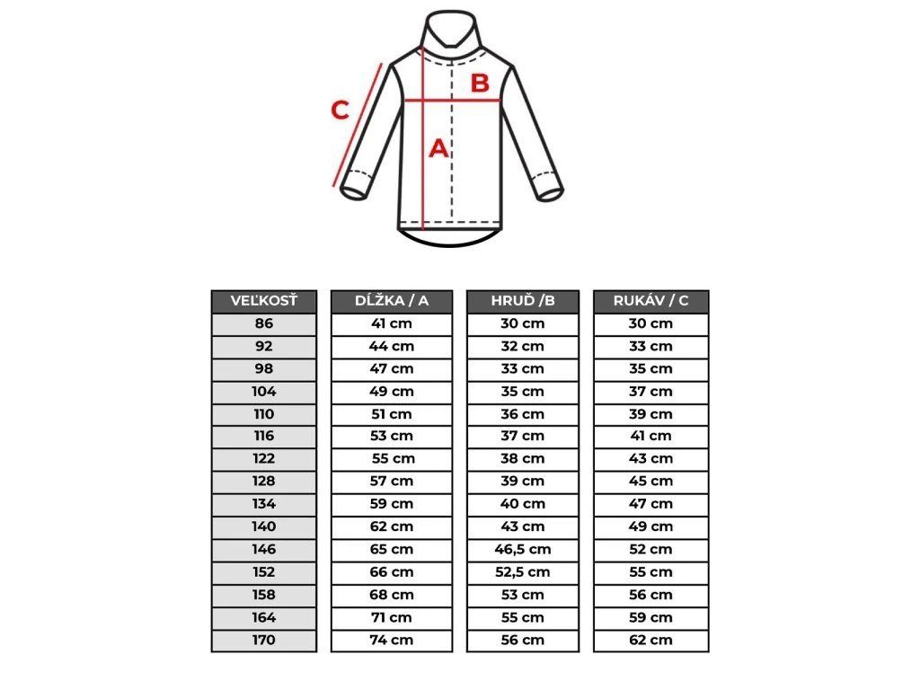 Tip na veľkosť: Vyberajte bežnú veľkosť, ktorú dieťa nosí. Strih je navrhnutý ako pohodlný. Ak však plánujete v zime hrubé vrstvenie (napr. hrubý sveter), zvážte objednanie o číslo väčšej veľkosti – manžety rukávy spoľahlivo udržia.