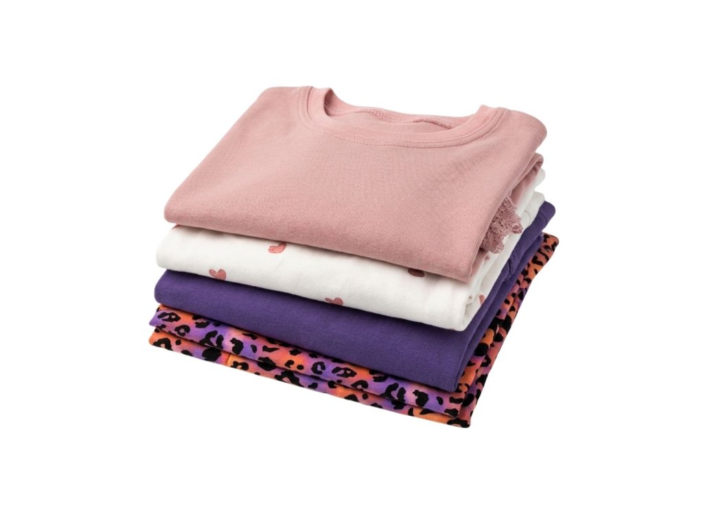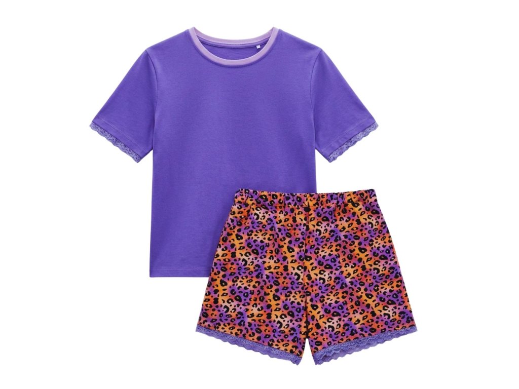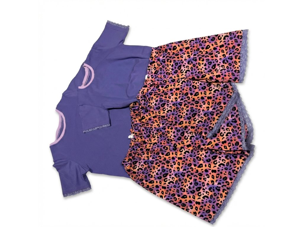 Štýlové dievčenské pyžamo pozostáva z jednofarebného fialového trička s krátkym rukávom a veselých leopardích šortiek v kombinácii ružovej, oranžovej a fialovej. Tričko má jemné čipkované lemovanie na rukávoch, ktoré dodáva pyžamu nežný dievčenský vzhľad. Šortky sú doplnené elastickým pásom pre maximálne pohodlie a taktiež zdobené čipkou v spodnej časti.