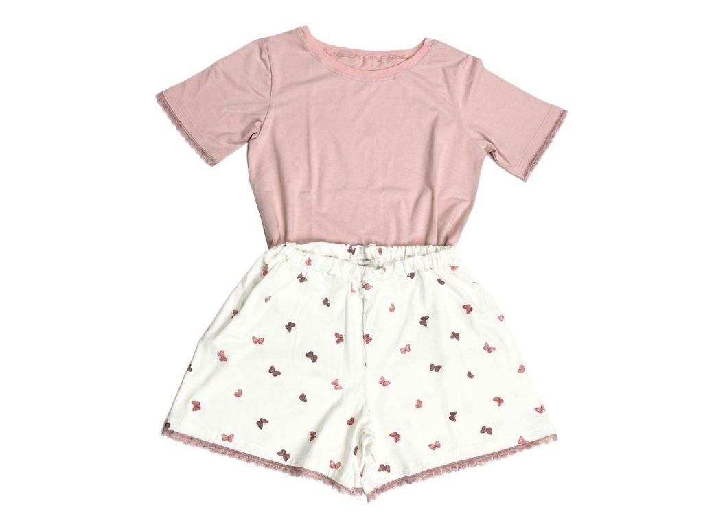 Štýlové dievčenské pyžamo pozostáva z jednofarebného ružového trička s krátkym rukávom a milých motýlikových šortiek. Tričko má jemné čipkované lemovanie na rukávoch, ktoré dodáva pyžamu nežný dievčenský vzhľad. Šortky sú doplnené elastickým pásom pre maximálne pohodlie a taktiež zdobené čipkou v spodnej časti.
